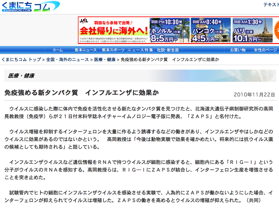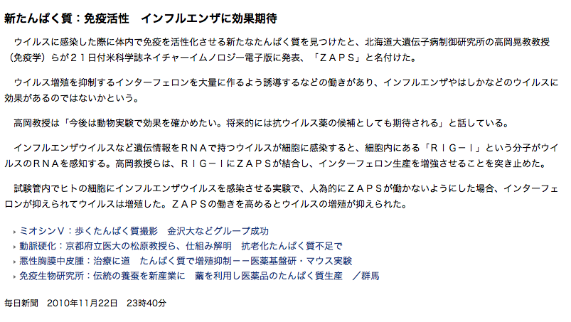Hayakawa, S., Shiratori, S., Yamato, H., Kameyama, T., Kitatsuji, C., Kashigi, F., Goto, S., Kameoka, S., Fujikura, D., Yamada, T., Mizutani, T., Kazumata, M., Sato, M., Tanaka, J., Asaka, M., Ohba, Y., Miyazaki, T., Imamura, M. and Takaoka, A.ZAPS is a potent stimulator of signaling mediated by the RNA helicase RIG-I during antiviral responses.Nat. Immunol.,12, 37-44, 2011.