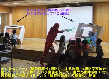 本活動では、「からだをまもるんジャーのしくみ」というタイトルで劇を独自に創作し、一部子供達参加型の劇を取り入れることで工夫しました(キャラクター作り、脚本や衣装なども全て独自に作成しました)。感染に対する免疫防御の仕組みについて、劇を交えたトークと顕微鏡をつかった標本の観察体験という2部構成で講義を行います。具体的には、“免疫戦隊まもるんジャー”が、各種“ばっちぃーマン(病原体;カビ、細菌、ウイルス)”とどのように戦ってからだをまもられるのかについて学びます(様子1・様子2・)。免疫不全ウイルス(HIV;えいずくん)も登場し、なぜ免疫不全をおこすのか?を学び、その裏返しの免疫の重要性を学ぶことや、抗ウイルスサイトカインであるインターフェロンについても専門用語と使わずに理解できることの工夫もあります。これに関連付けて日常のうがい・手洗いの意義などについて補足します。後半は、病原体(ばっちぃーマン)や免疫細胞(まもるんジャー)を実際に顕微鏡で観察します(様子3)。これらがどれほど小さいものであるかを説明することで日常見えないミクロの世界が存在していることに気づく機会を園児に提供するのも本活動の重要な目的の1つです。